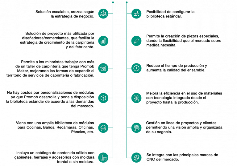 La tecnología de Promob Maker incluye una biblioteca estándar con un modelo de construcción que puede se configurar para satisfacer las necesidades específicas de su empresa. A través de plug-ins, genera información de producción: dibujos técnicos, reportes de producción, listas de corte, integración con optimizadores de corte, generación de programas de máquinas.